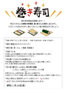 巻き寿司教室を開催します プロの講師にコツを学びながら、楽しくおいしい寿司を作りましょう!! 会員以外の方もご参加いただけます♫ 皆様のご参加お待ちしております(*´▽`*) 講師・園 修さん≪魚駒 料理長≫ 日時・令和7年12月4日 午前10時30分~午後12時まで 場所・菩提寺まちづくりセンター ↓↓ 詳しくは下記のファイルをクリックください ↓↓ 巻き寿司教室 開催案内
